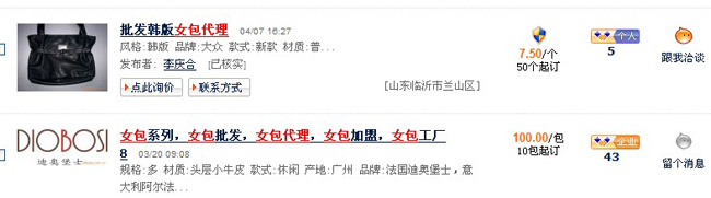 2, 然后设置关键词。将我们找到的关键词做为我们发产品的信息。在排列的时候要注意词的排放位置:发布信息的框中可以写多写点,不要很单一。例如:女包 女包特价 女包单肩包 这就是一组关键词。女士挎包 女士钱包 女士用品 也是一组关键词。